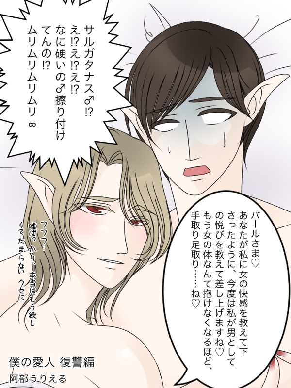 二枚目はバール(夫)に略奪されたアスタロト(妻)の愛人サルガタナスが朝起きたら漢になってて愛しのバールを調教しそうな図。願わくば本番まで完了しますように♡